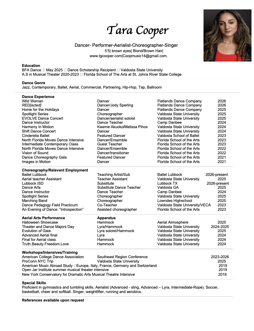 Tara Cooper is a dancer, performer, choreographer, and singer from Gainsville, FL. She recently graduated from Valdosta State University to receive her BFA in Dance to pursue her career in the arts. She received her Associate of Science in Musical Theater from the Florida School of the Arts in Palatka, FL. Tara is currently based in Lubbock, TX where she works as a teaching artisit, aerial instructor, and performer, continuing to share her passion for the arts through education and performance. She was an officer of the NHSDA (National Honor Society of Dance Arts). Her background is in many styles, such as jazz, aerial, contemporary, ballet, hip hop, tap and ballroom. She is a dedicated and committed artist who is driven to see the value of never giving up.